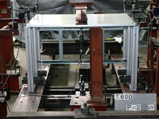 脚部を固定し段版を設置した状態で、水平(一方)方向の荷重を負荷し、破壊時点までの経過観察。